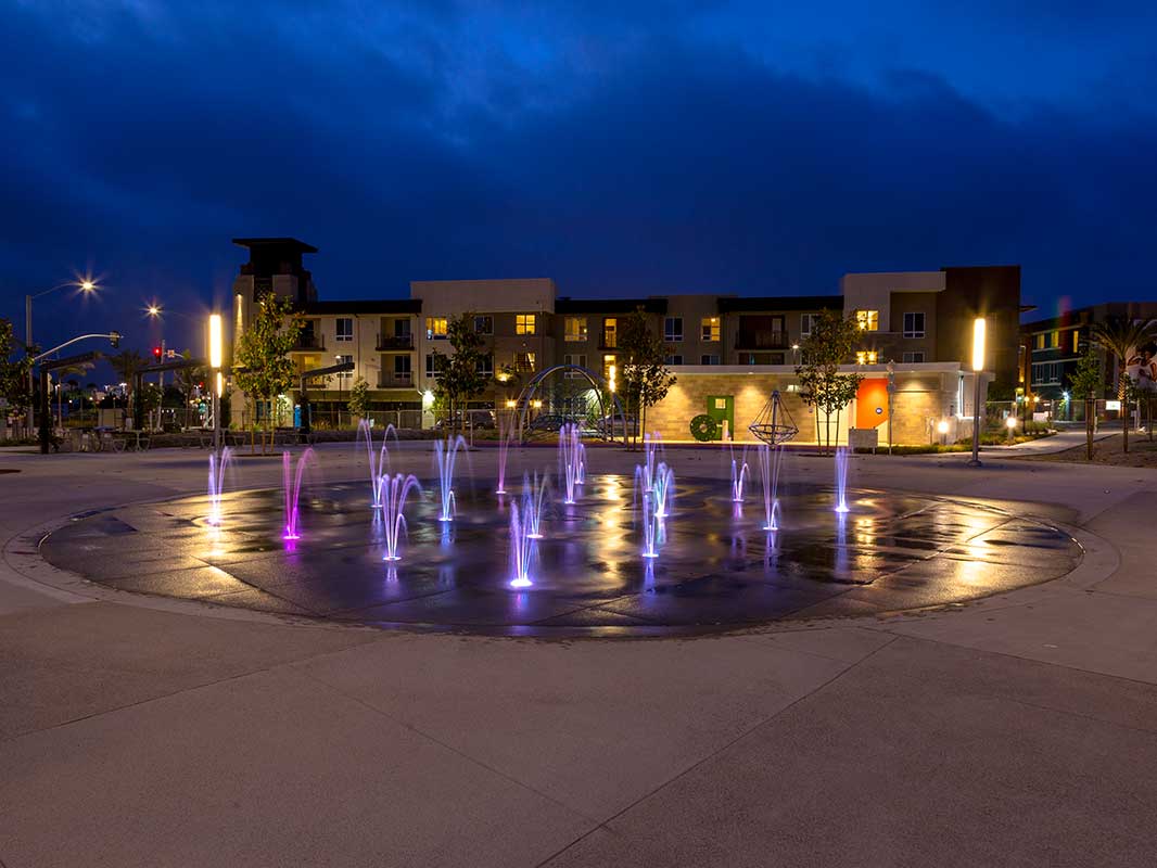 This interactive splash pad lights up the night at a groundbreaking urban development in South San Diego County. At 210 acres, the Millenia development integrates housing, retail, commercial and park space to create a vibrant and self-sustaining community that offers something for everyone—waterplayers included.Â